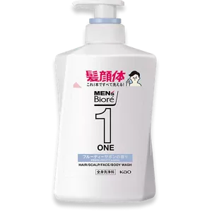 髪、顔、体、全てを洗えるメンズビオレONE!1本で全身のアブラ超スッキリ!フルーティーサボンの香り。