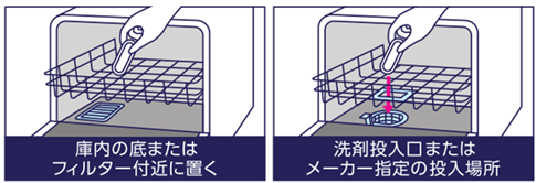 ●洗剤投入口、またはメーカー指定の投入場所がある場合は、食洗機の取扱説明書にしたがってください。