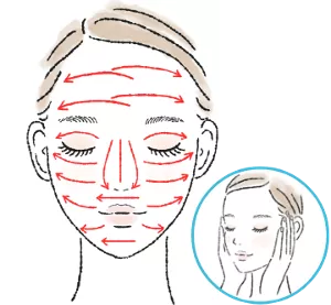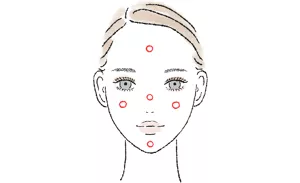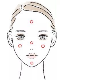 ①適量を顔の5カ所(両頬、額、鼻、あご)にのせます。