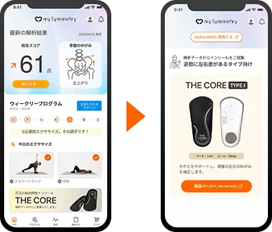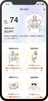 アプリ「my Symmetry」は歩行解析から身体のゆがみを解析し、対策を提示するアプリです。解析結果は、歩いたときの状態から、日常的な身体バランスの傾向を推定した参考情報です。医療機器プログラムではなく、疾病の治療、診断、予防を目的としたものではありません。医療機関の診断の代替になるものではないため、必要に応じて医療機関を受診することをおすすめいたします。また本アプリで提供するエクササイズはあくまで一例であり、医療上の指示ではありません。運動に関して不安がある場合は、医師や専門家に相談してください。