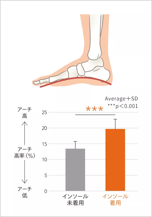 59 名の方に計測したところ、インソールの着用時に、すべての方(100%)において「アーチの高さ」の補整が確認されました。