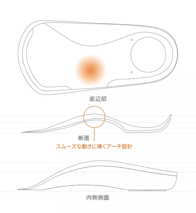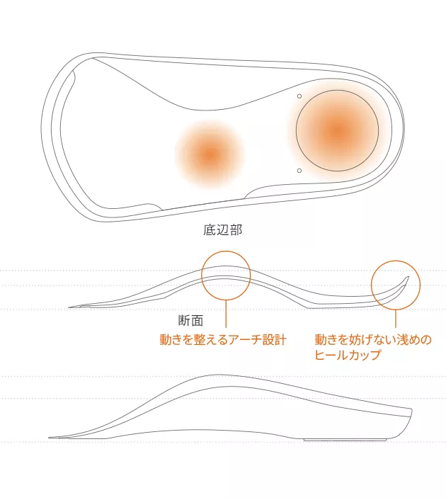 動きを妨げない適度なヒールカップ設計で、着用時の姿勢と動きの補整を両立。着用時にスムーズで整った足運びや動きに導きます。