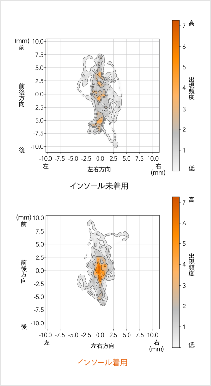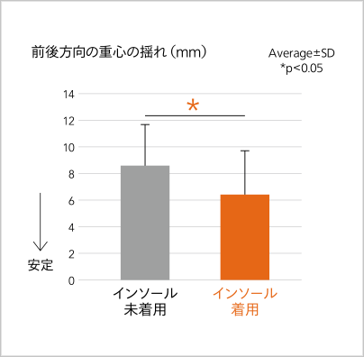 インソール着用時に身体のブレが減少。前後方向の重心の揺れが有意に改善しました。
